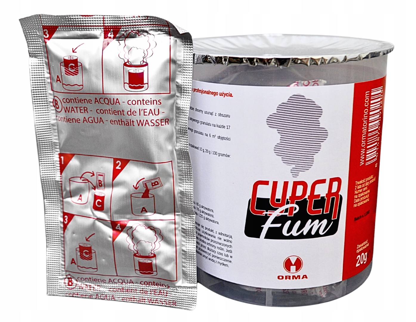 - 1 sztuka generatora dymu CYPERFUM 20g (tuba z granulatem biobójczym i aktywatorem)